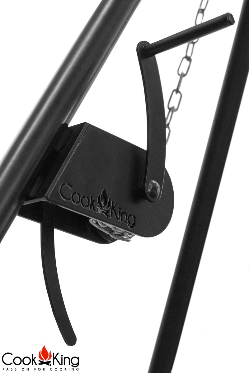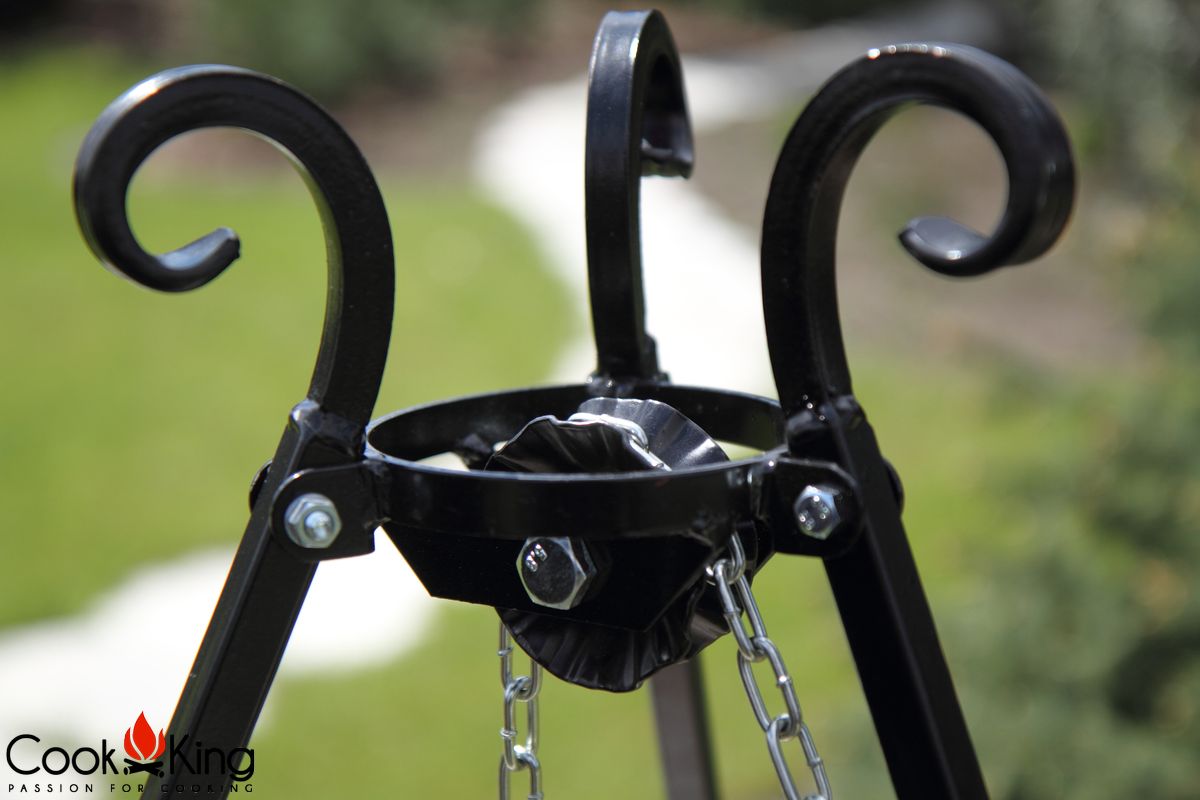 Ein Dreibein für einen Grill, einen Kessel oder einen Wok mit einer Höhe von 200 cm gibt die Möglichkeit, Speisen voller Wohlgeruch zuzubereiten. Es bildet samt dem Rost, Kessel und Wok sowie den speziellen Ketten ein ideales Grillset. Dieses Dreibein ist pulverbeschichtet, weshalb es vor mechanischen Beschädigungen geschützt ist. Die dekorative Rolle, über die die Kette geführt wird, lässt die Höhe des Rostes, Kessels oder Woks gewandt regulieren.